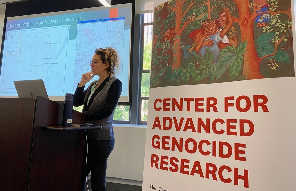 An in-person audience of around 50 people attended the talk, including many undergraduate students from classes in history (“Mass Violence and Comparative Genocide in Modern World History”) and law (“Global Justice for Mass Atrocities and Genocide.”)