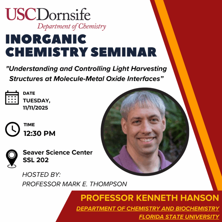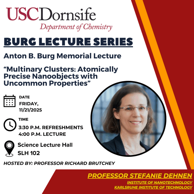 Faculty in the Department of Chemistry are active members of several interdisciplinary research centers and programs. They work together with graduate students, undergraduate students, and postdoctoral researchers to develop novel solutions to scientific problems and tackle pressing societal challenges. Through collaboration and ground-breaking research, the community of chemists at USC make a global impact.