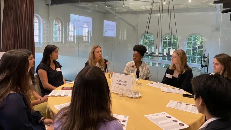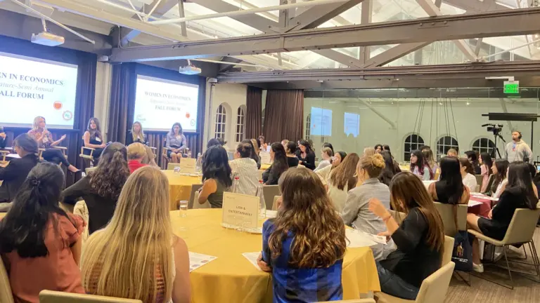 Despite progress, women remain underrepresented in the field of economics. Our Women in Economics (WiE) group seeks to inspire the next generation by encouraging young women to pursue economics degrees. WiE sponsors a variety of programs that introduce students to alumnae, highlight their diverse achievements, and showcase the versatility and impact of an economics degree.