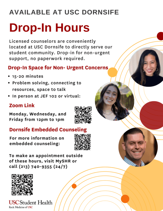 Students can also come for a drop-in meeting with no formal intake appointment needed! USC Student Health embedded counselors are here to support you in your community.