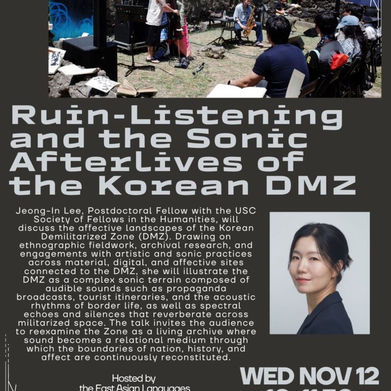 Jeong-In Lee, Postdoctoral Fellow with the USC Society of Fellows in the Humanities, will discuss the affective landscapes of the Korean Demilitarized Zone (DMZ). Drawing on ethnographic fieldwork, archival research, and engagements with artistic and sonic practices across material, digital, and affective sites connected to the DMZ, she will illustrate the DMZ as a complex sonic terrain composed of audible sounds such as propaganda broadcasts, tourist itineraries, and the acoustic rhythms of border life, as well as spectral echoes and silences that reverberate across militarized space. The talk invites the audience to reexamine the Zone as a living archive where sound becomes a relational medium through which the boundaries of nation, history, and affect are continuously reconstituted.