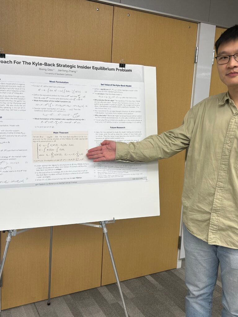 Student Spotlight: Congratulations to Bixing Qiao for his paper “Set Values of Dynamic Nonzero Sum Games and Set Valued Hamiltonians” (https://arxiv.org/abs/2408.09047), joint with our very own Jianfeng Zhang! In this paper, they propose to use PDE approach for general stochastic differential games which typically have multiple values and thus are viewed as a type of ill-posed problem in the literature. Bixing’s work concerns PDE characterization of the dynamic set value function. It provides a convenient and powerful tool for studying general games. Want to learn more? Bixing has been invited to present at the upcoming Joint Mathematics Meetings in Seattle. Catch him live on Saturday January 11 at 2:30pm in the AMS Special Session on Financial Mathematics, II. Congratulations, Bixing!