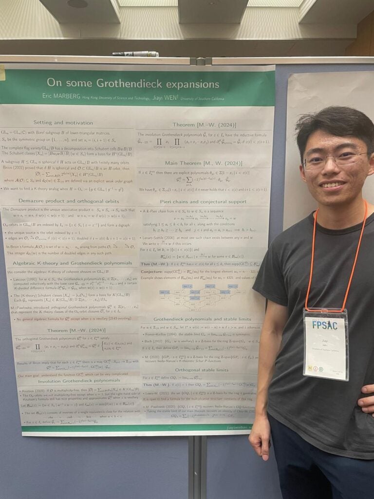 Congratulations to Jiayi Wen for his presentation at FPSAC 2025 in Japan! Formal Power Series and Algebraic Combinatorics (FPSAC) is the largest and longest running annual international conference in combinatorics which has a competitive peer-review process for vetting submissions. Jiayi’s work with Eric Marberg deriving new formulas for K-theory was among the accepted papers for this year. The full arxiv preprint can be read here. Together, they generalize the expansion for symplectic Grothendieck polynomials into classical Grothendieck polynomials to the orthogonal case when the indexing permutation is vexillary. We expect this will be the first of many future presentations for Jiayi at FPSAC. Congratulations again!