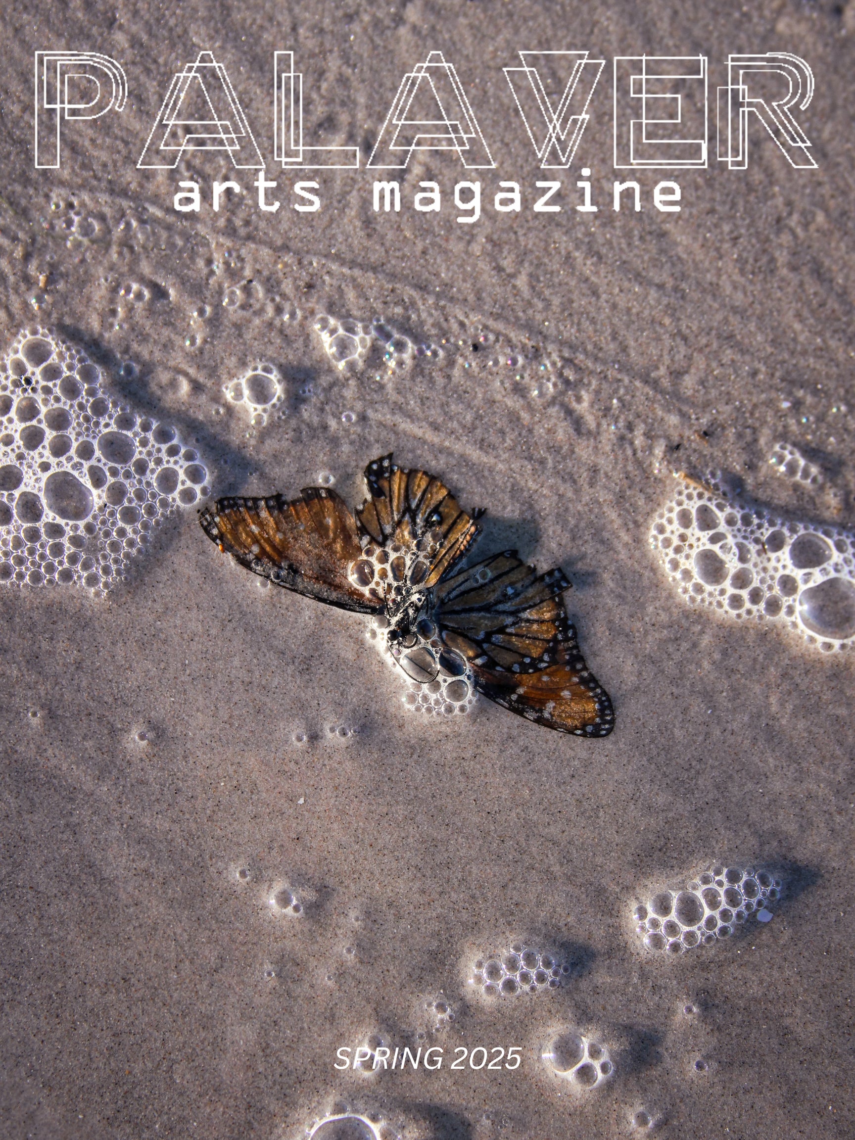 Palaver Arts Magazine Spring 2025 Cover, a dead butterfly laying on the shore with the bubbles of the receding tide