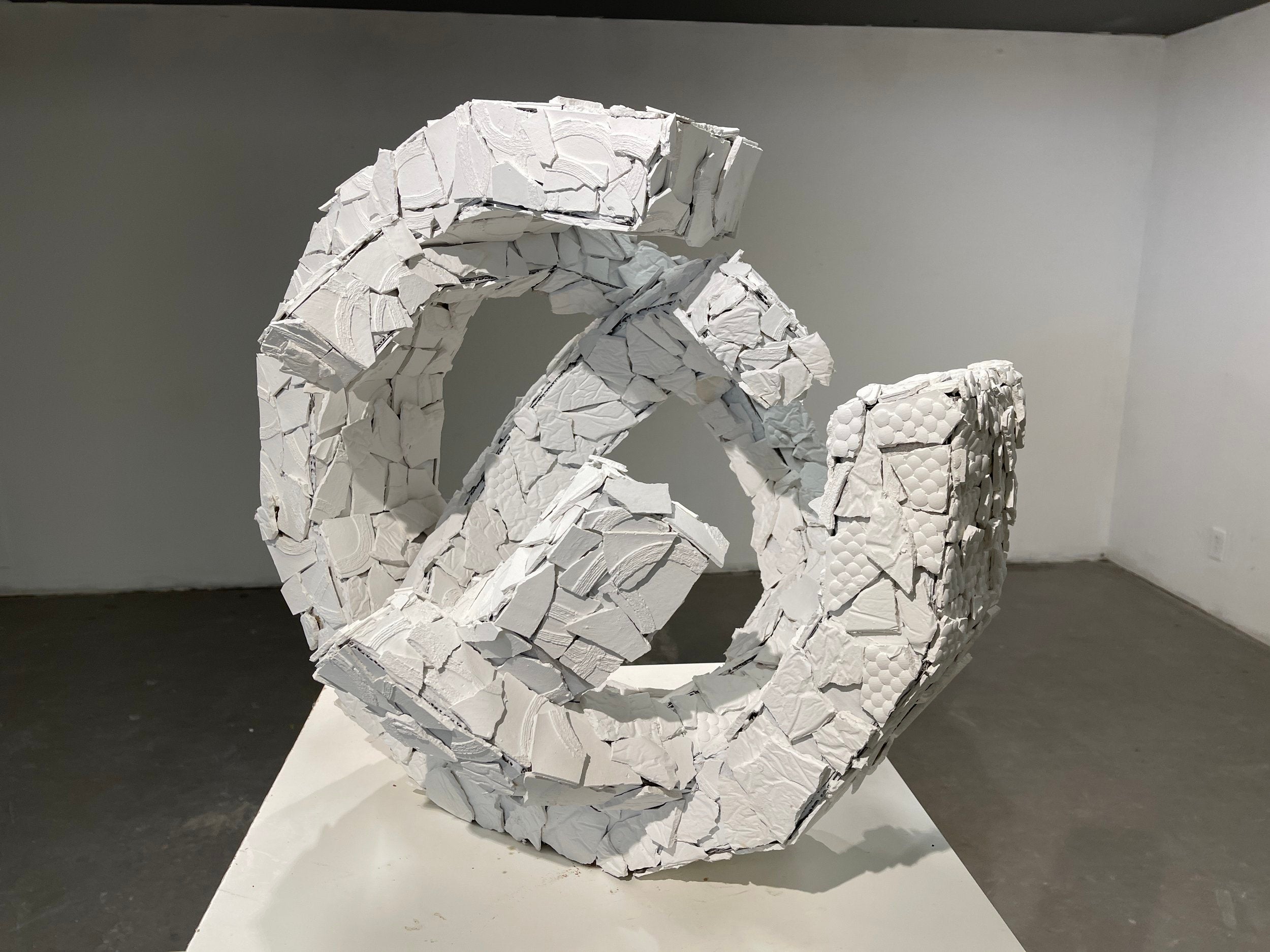 “This piece explores the duality of creation and destruction. Depending on context, these two actions can be one in the same. In carving a wooden figure, one simultaneously breaks down the wood and creates something new. My artwork exists in a constant state of destruction and creation. In the making of the piece, I made plaster casts which I then broke into many shards and attached to a cardboard structure. The plaster surface becomes a place of both fragmentation and accumulation. Similarly, the cardboard structure itself is three concentric circles, but these circles are incomplete, forever in a state of being finished or erased. In this way, the viewer must ask whether this piece is being built up or broken down.”