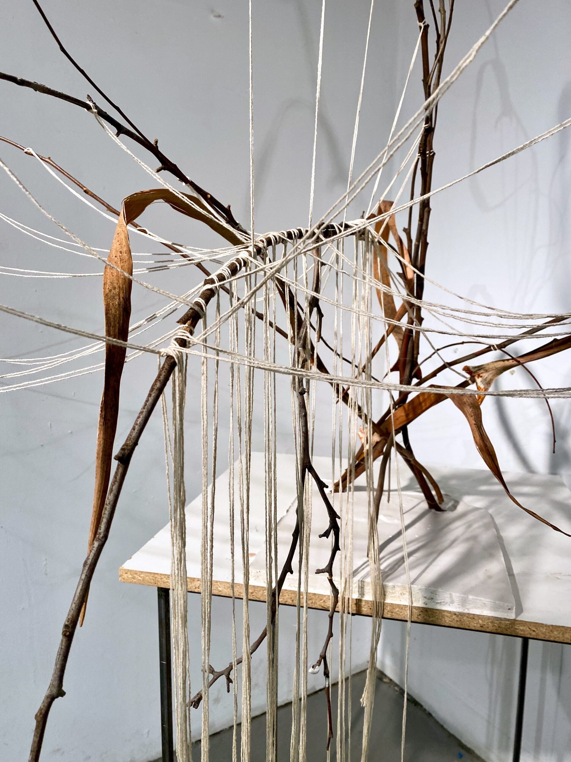 “Willow trees have been a core memory in my life back in China when I was young, with the branches flowing down and across my hand through the wind. The piece is a representation of a growing willow tree in my mind after these years in a country different from my country of origin. The branches and leaves were found in the streets of Los Angeles, and they are connected and bound by the twine. The desperation of growth seen through the opening and reaching of the branches’ wings is restricted and prohibited by the tying twine that also supports and holds together the entire tree. The torn and opposite tension within the tree reflects my constant struggle for identity as to belonging within society, to grow under restrictions.”