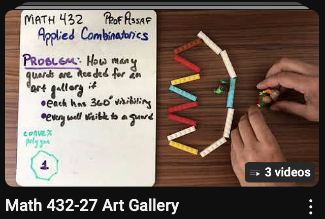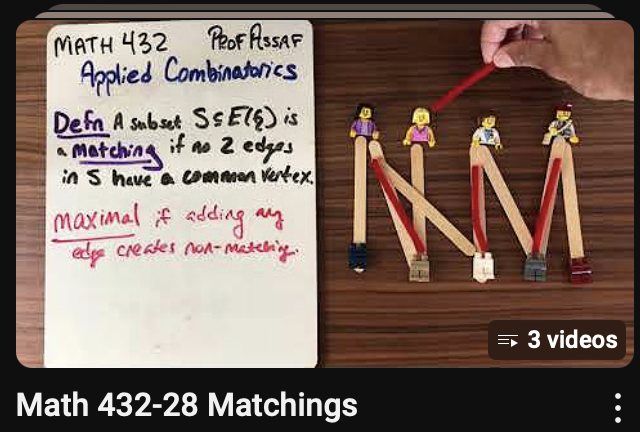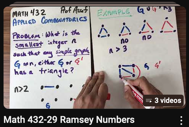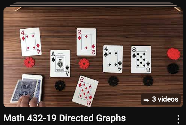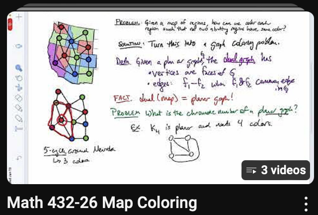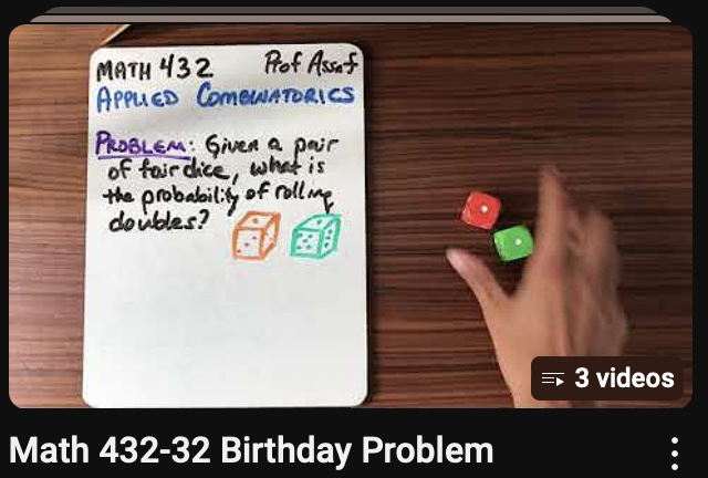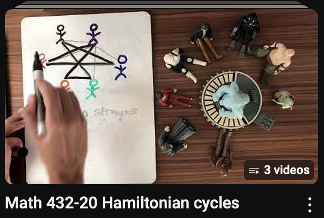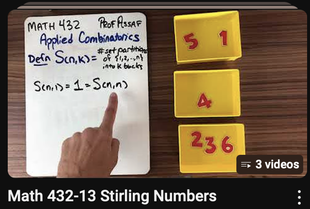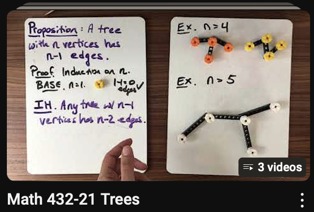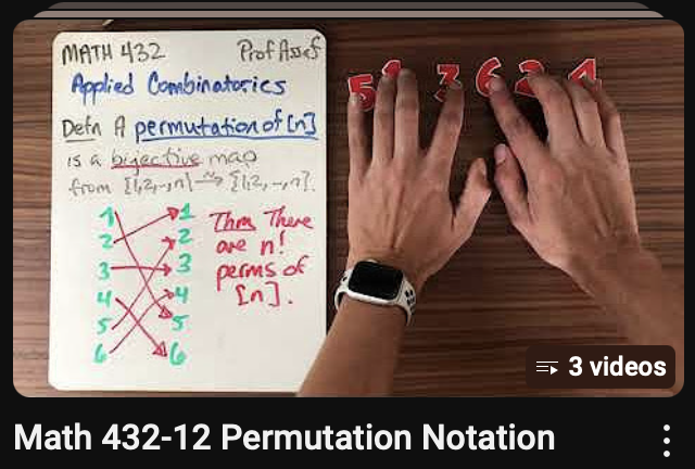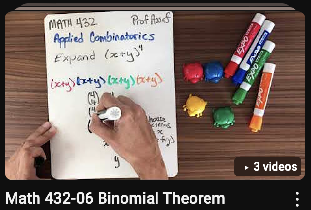 The videos below are the lectures for Math 432 – Applied Combinatorics which I taught as a flipped class in Spring 2021. Each lecture has 3 associated videos, about 5 minutes each, following the content of Miklos Bona’s textbook, A Walk Through Combinatorics.