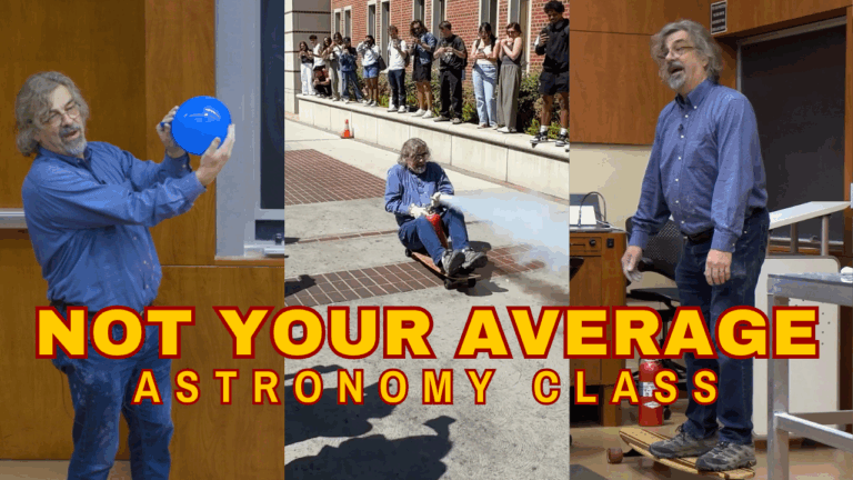 Professor Nick Warner’s popular general education course titled “The Universe” is often the last science class many USC students take, and he wants it to be memorable. Watch as he demonstrates Newton’s Third Law of Motion in ASTR 100.